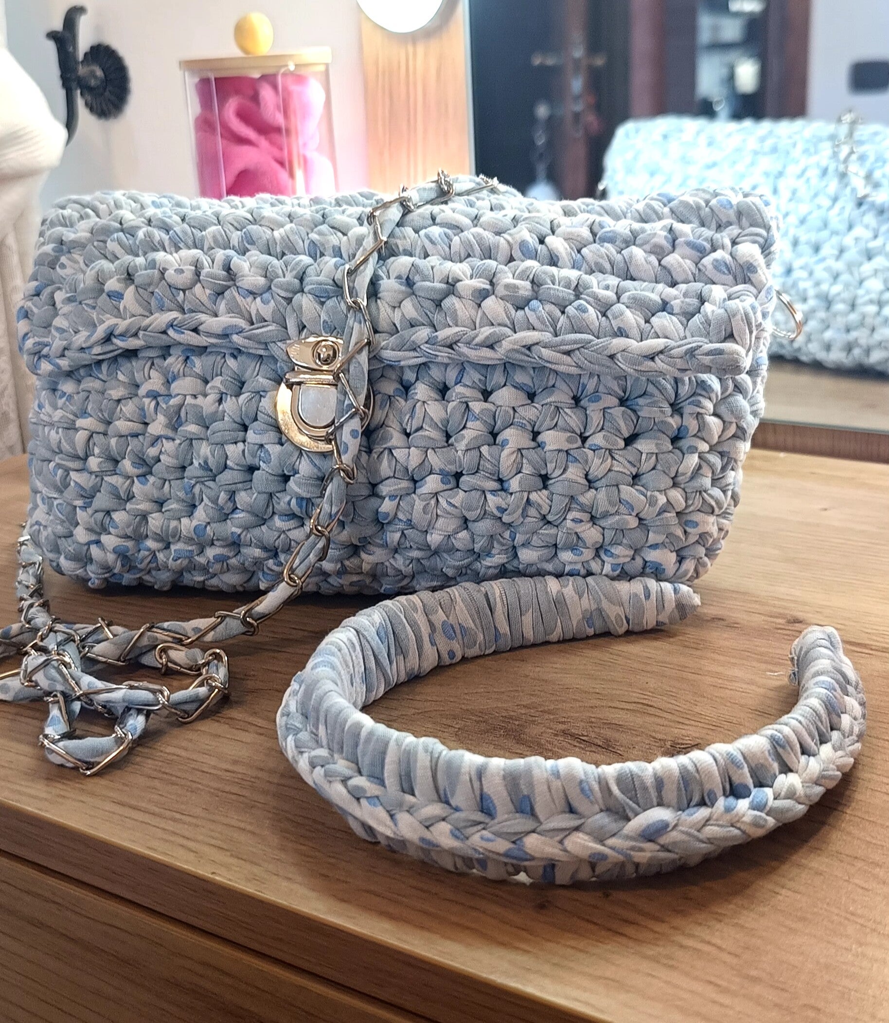 Cerchietto realizzato a uncinetto. Coordinato con borsa e laccio per telefono