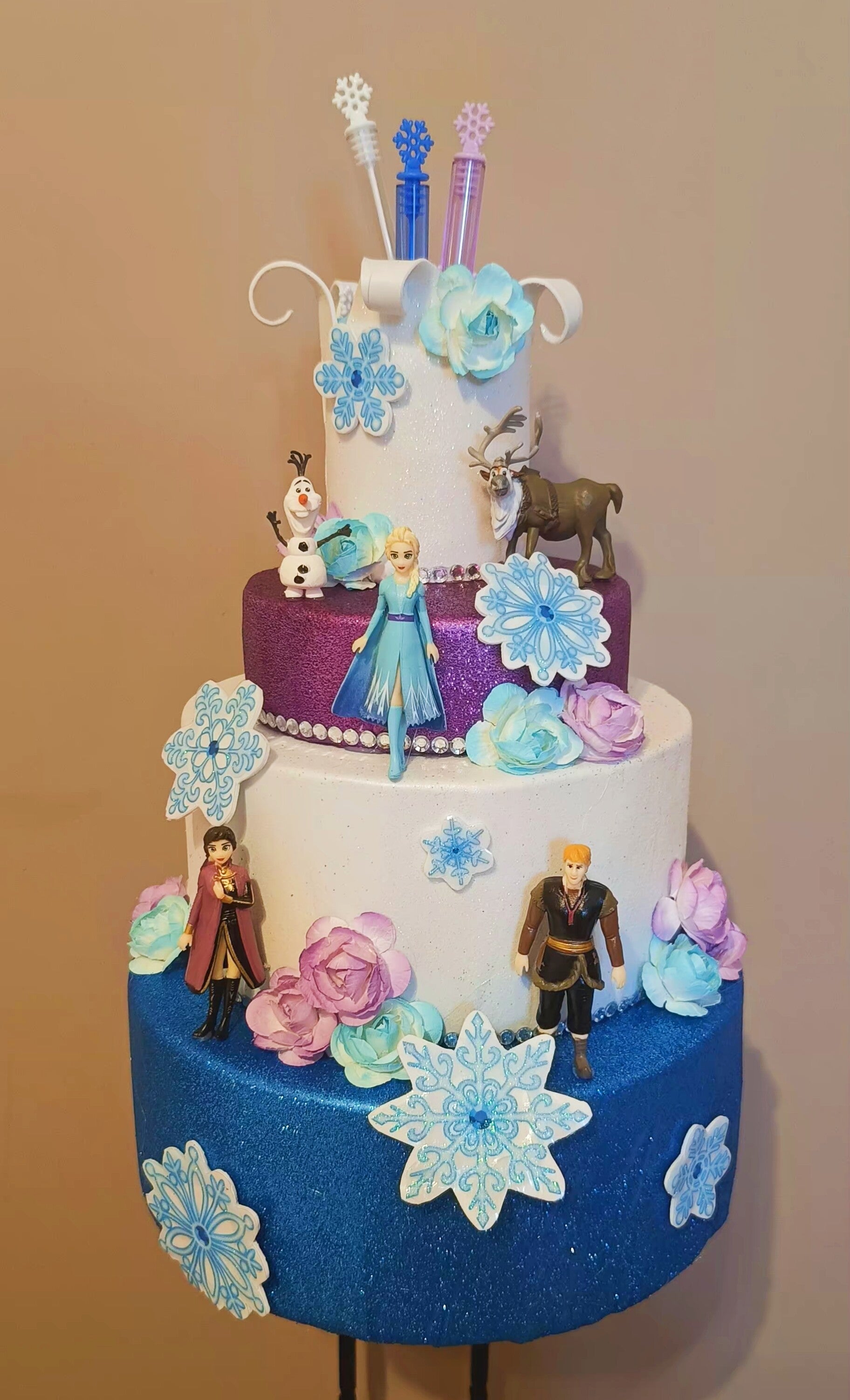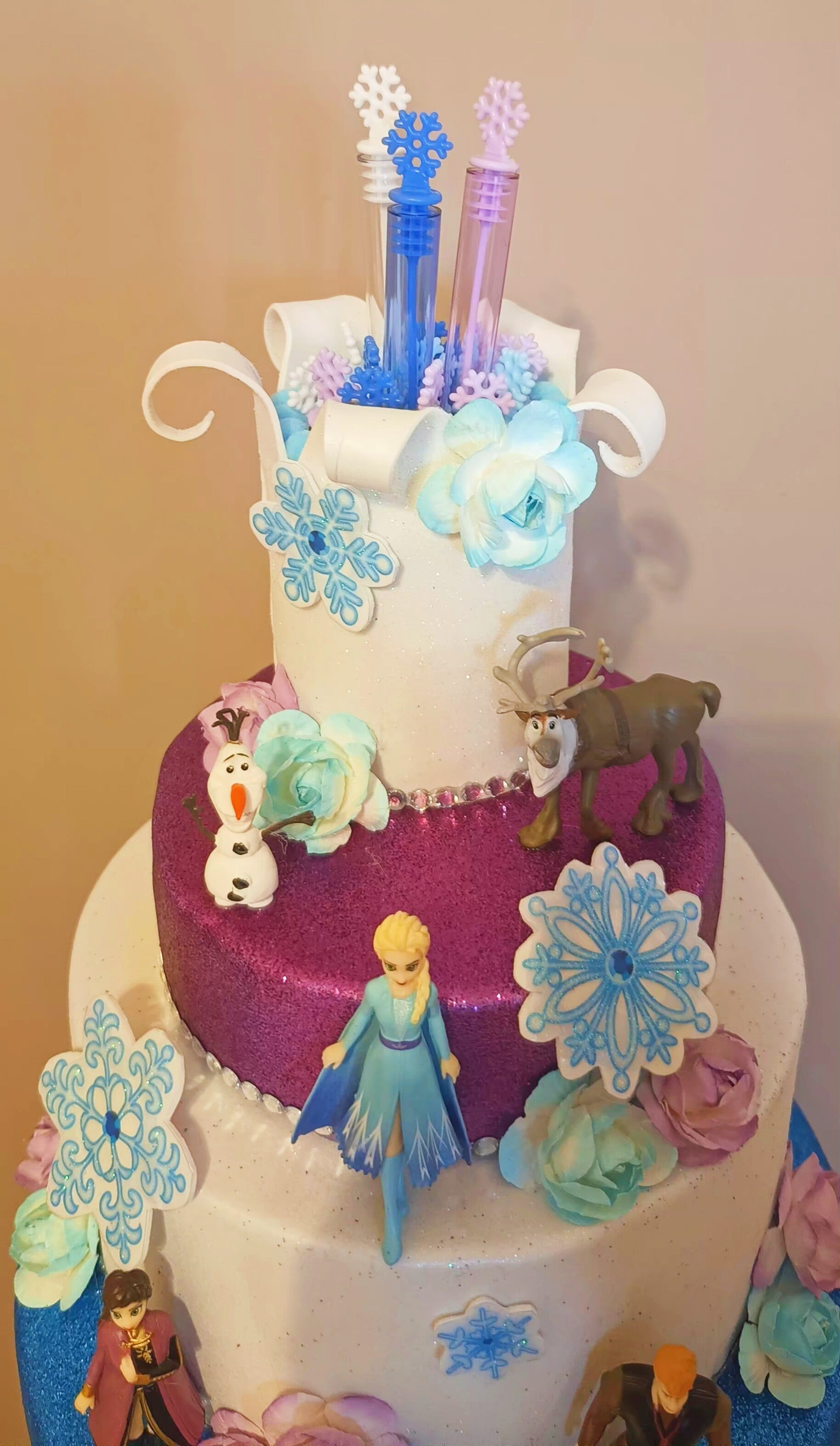 torta scenografica tema Frozen con bolle di sapone per regalini fine festa. 4 piani + personaggi in 3d